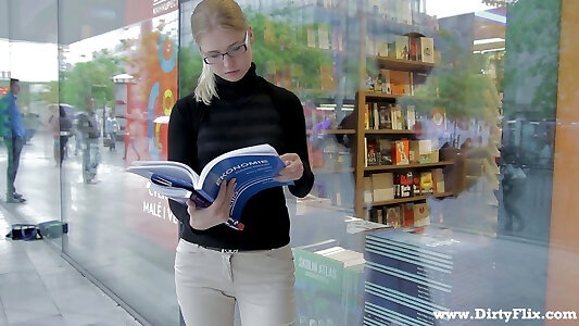 Nerdy girl with large glasses and the pulsating cock