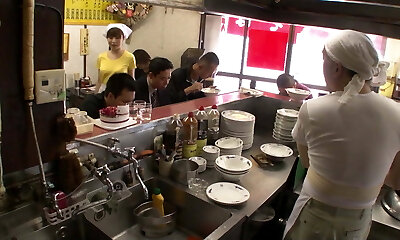 Kitchen maid in Asia Shop gets fucked by every stud in the Shop